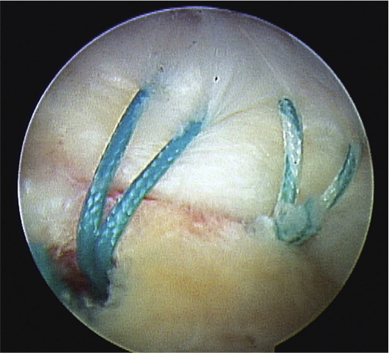 Rotator Cuff reattached with sutures onto the humerus bone